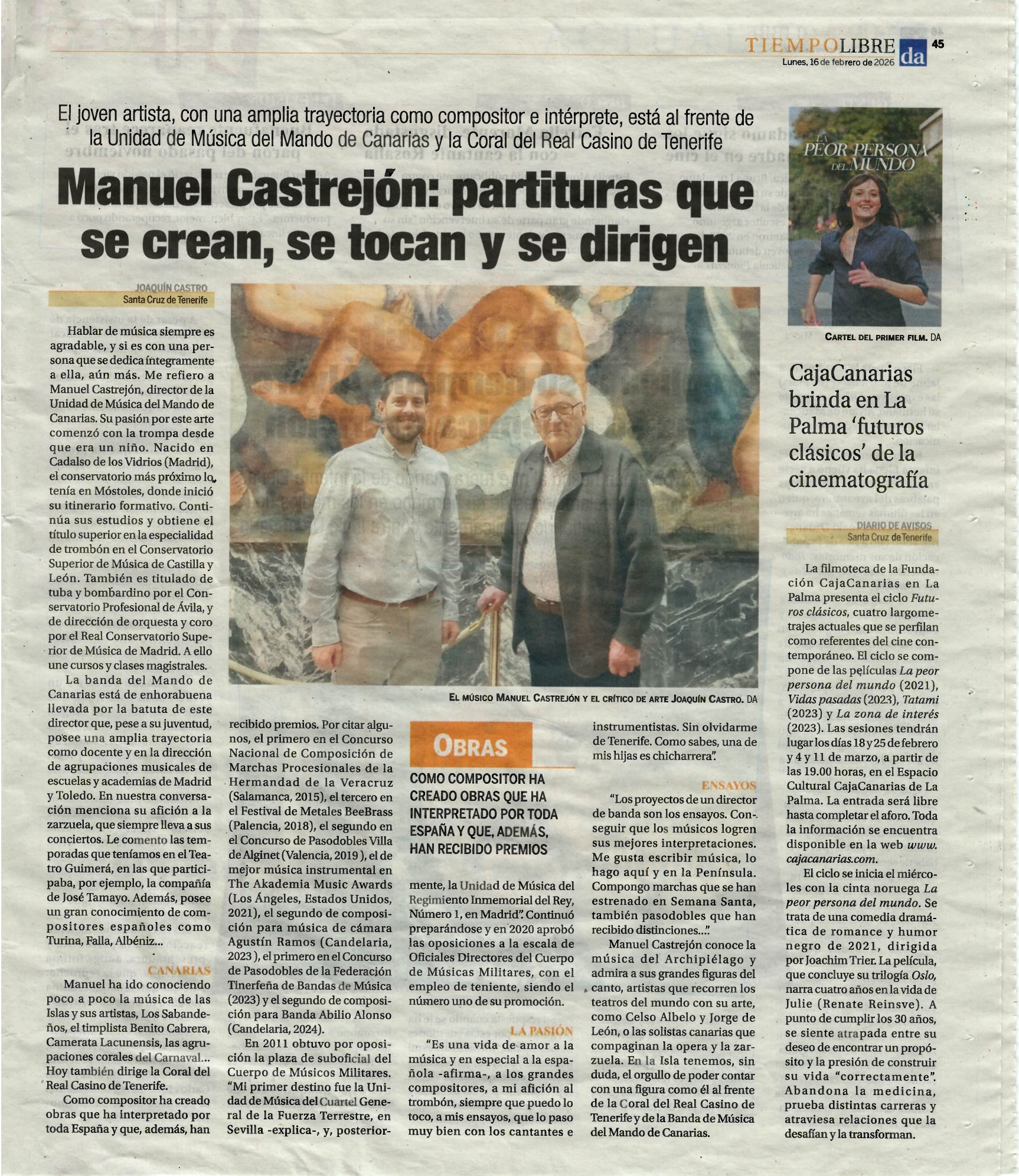Compartimos información del periodista Joaquín Castro en el Diario de Avisos sobre la trayectoria musical de Manuel Castrejón, director de la Coral del RCT y de la Unidad de Música
