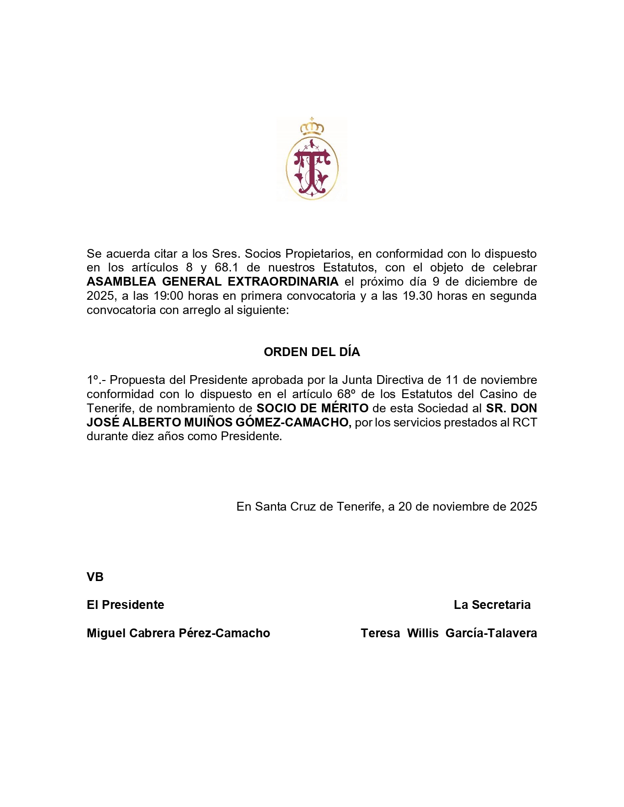 El martes 9 de diciembre a las 19:00 horas en primera convocatoria y a las 19:30 en segunda para el nombramiento como Socio de Mérito del Sr. D. José Alberto Muiños Gómez-Camacho por los servicios prestados durante diez años como presidente del RCT.