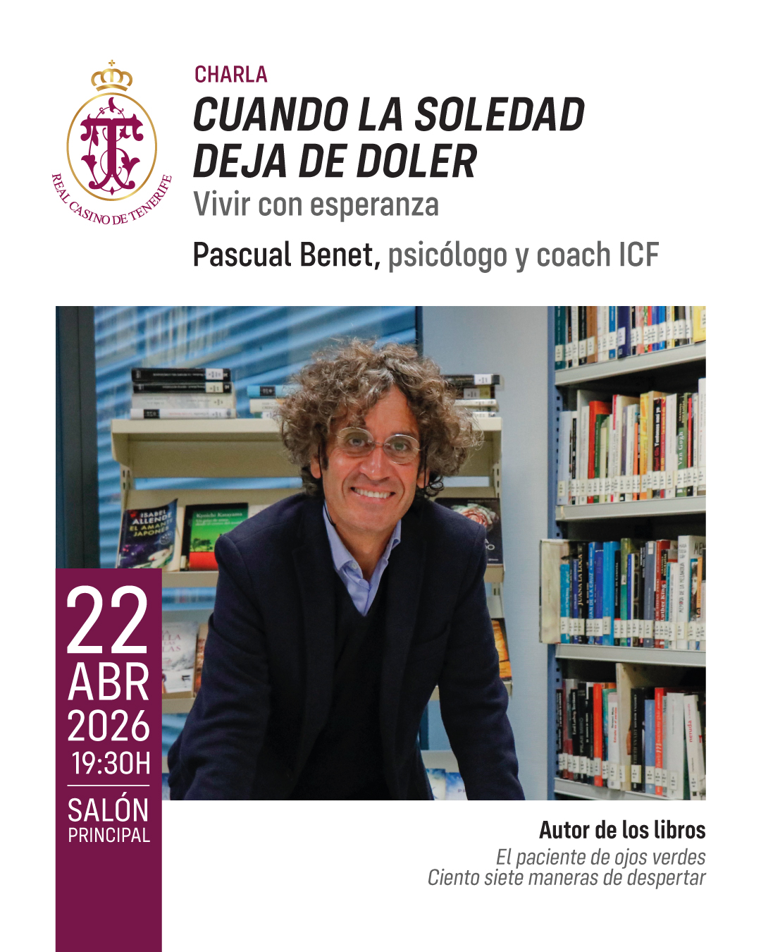 El miércoles 22 de abril, a las 19:30 horas, el psicólogo y coach ICF, Pascual Benet, ofrecerá una charla en el Salón Principal bajo el título «Cuando la soledad deja de doler. Vivir con esperanza».