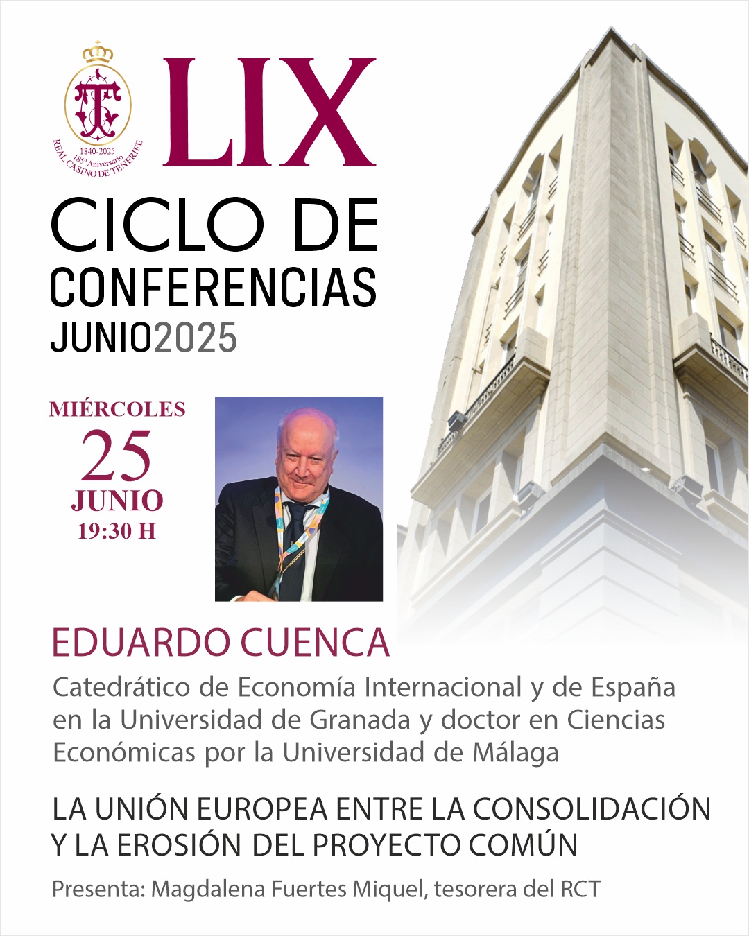 El miércoles 25 de junio, a las 19:30 horas, el doctor en Economía Eduardo Cuenca clausurará el LIX Ciclo de Conferencias 2025, con la ponencia titulada La Unión Europea entre la consolidación y la erosión del proyecto común.