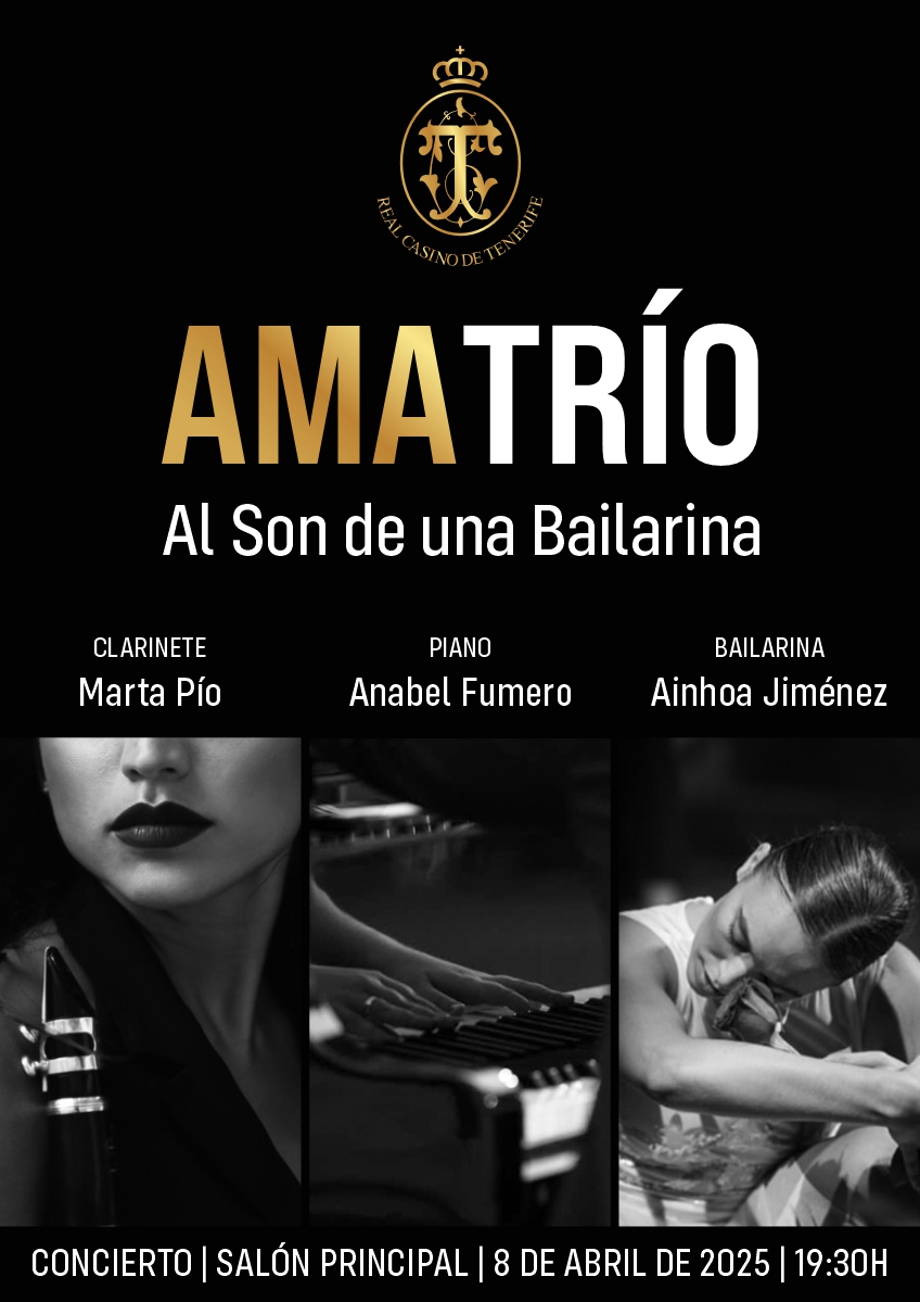Mañana martes, 8 de abril, a las 19:30 horas, se ofrecerá en el Salón Principal el concierto «Al Son de una Bailarina», a cargo del grupo AMA Trío, integrado por Marta Pío (clarinete), Anabel Fumero (piano) y Ainhoa Jiménez (bailarina).