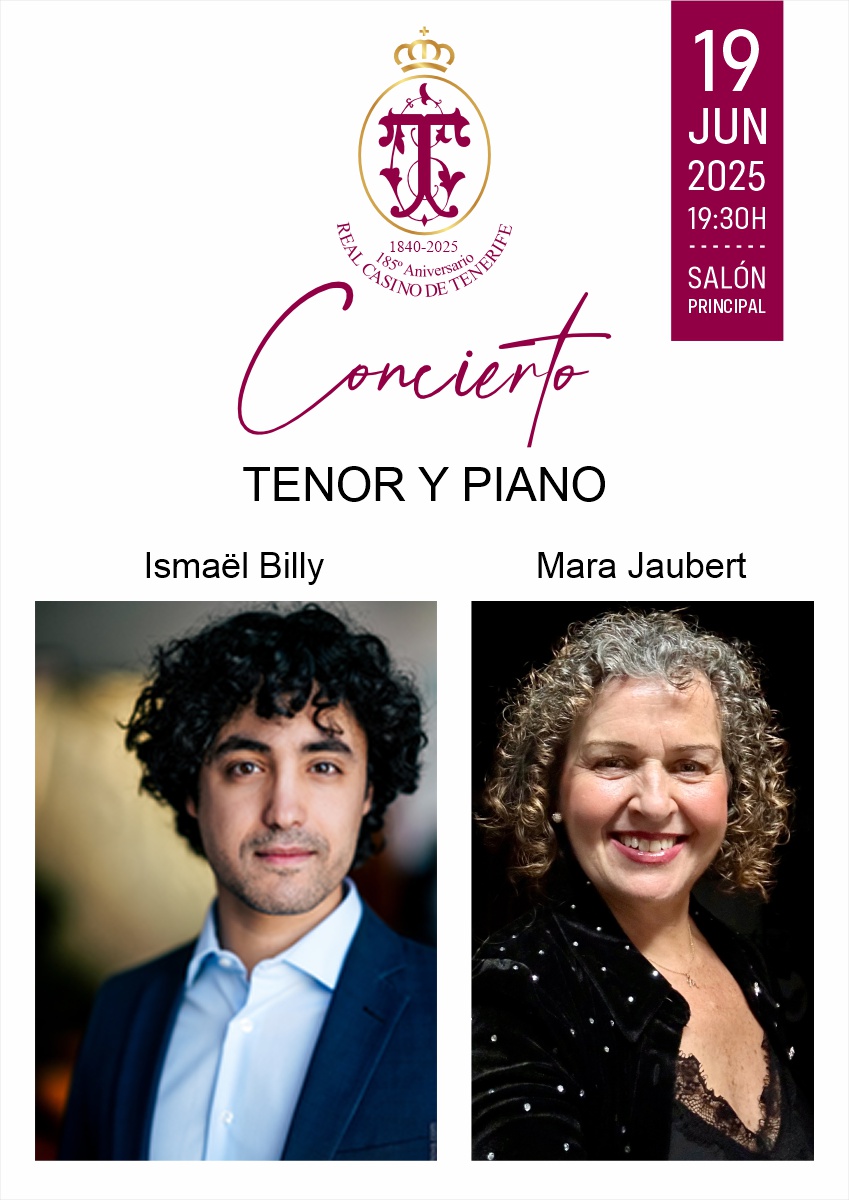 El jueves 19 de junio, a las 19:30 horas, el tenor Ismaël Billy y la pianista Mara Jaubert ofrecerán un concierto en el Salón Principal con motivo de los actos del 185 aniversario del Casino.