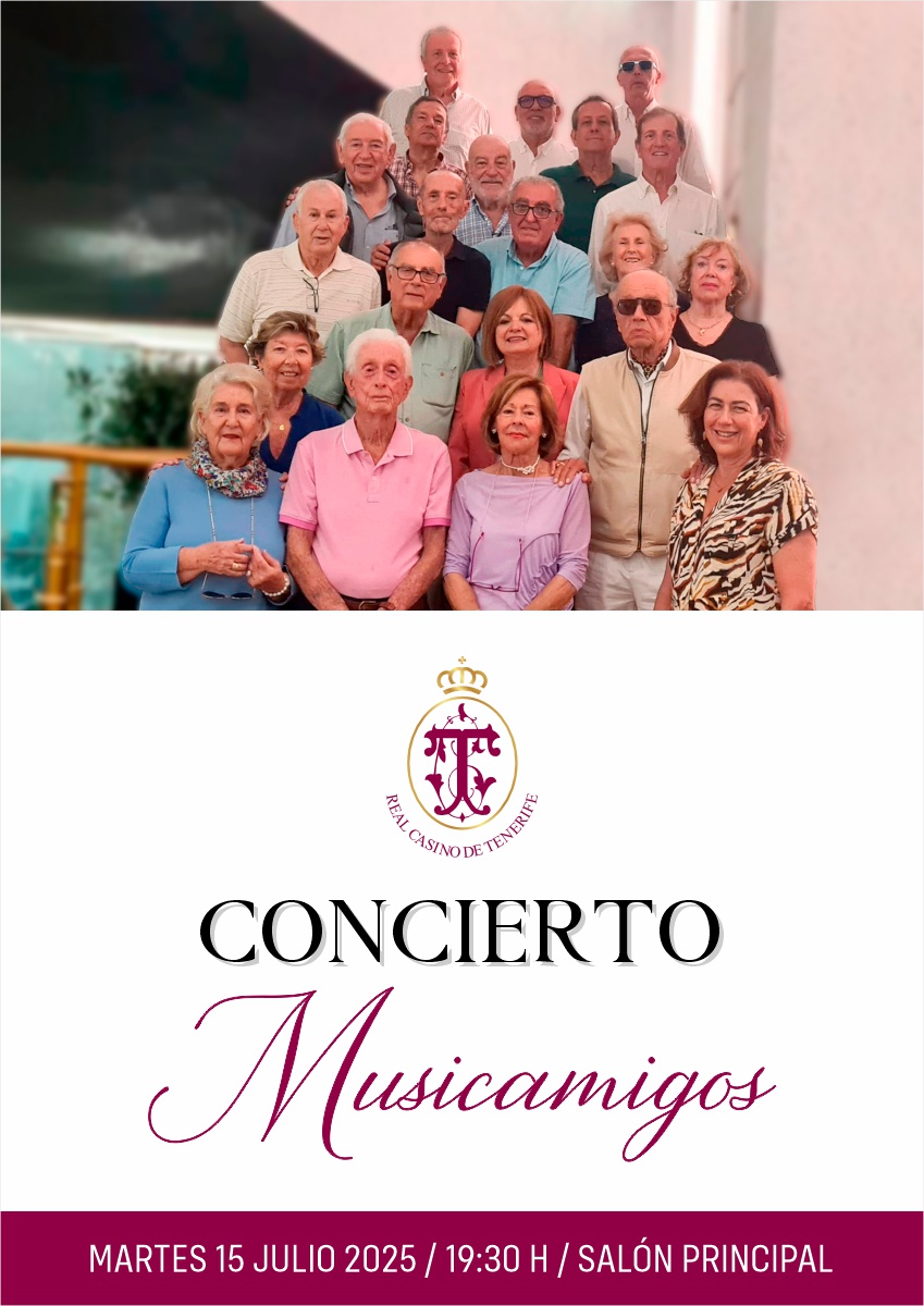 El martes 15 de julio, a las 19:30 horas, se celebrará en el Salón Principal el concierto del grupo Musicamigos, integrado por los Socios y Socias de nuestra Sociedad, bajo la dirección de Manuel Pérez.