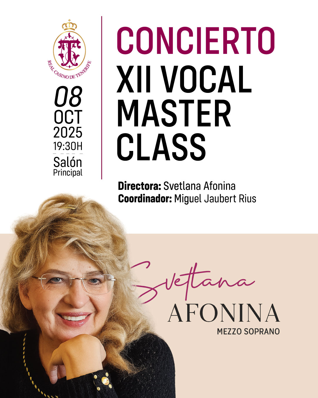 El miércoles 8 de octubre, a las 19:30 horas, se ofrecerá en el Salón Principal el concierto correspondiente a la XII Vocal Master Class, dirigido por Svetlana Afonina y coordinado por Miguel Jaubert Rius.