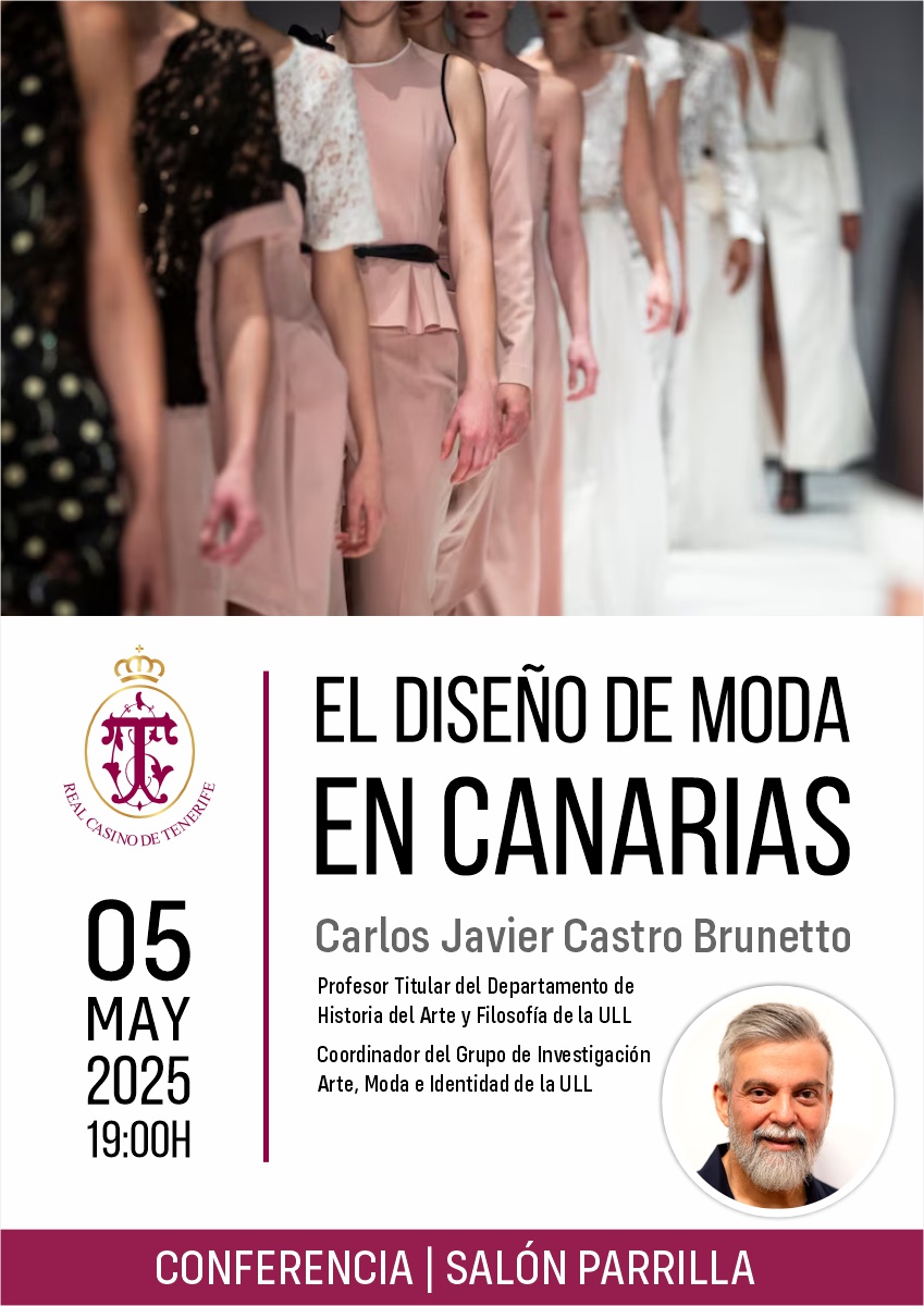 El lunes 5 de mayo, a las 19:00 horas, se ofrecerá en el Salón Parrilla la conferencia «El diseño de moda en Canarias», a cargo de Carlos Javier Castro Brunetto, doctor en Historia del Arte en la Universidad de La Laguna (ULL).