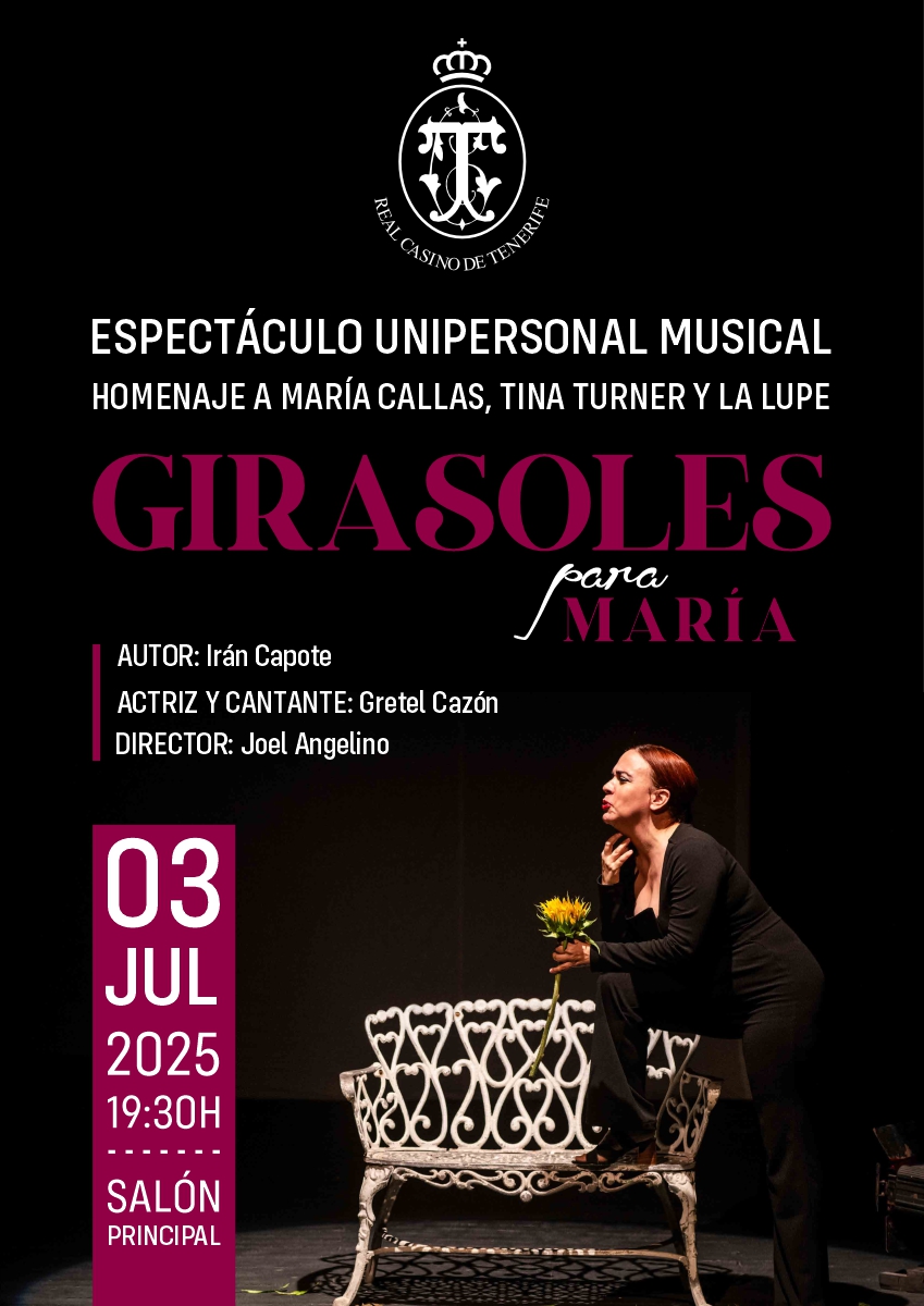 El jueves 3 de julio, a las 19:30 horas, se ofrecerá el espectáculo unipersonal musical “Girasoles para María”, interpretado por la actriz y cantante Gretel Cazón.