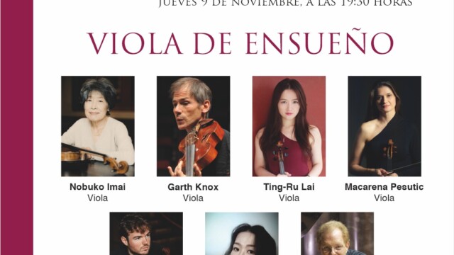 -Jueves 9 de noviembre, Viola de Ensueño, con los violistas Nobuko Imai, Garth Knox, Ting-Ru Lai, Macarena Pesutic y Timothy Ridout, y los pianistas Javier Lanis y Minze Kim
