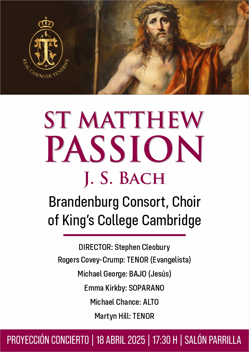 Con motivo de la Semana Santa, este viernes, 18 de abril, a las 17:30 horas, se proyectará el concierto «La Pasión según San Mateo», de J.S. Bach, en el Salón Parrilla (antiguo gimnasio).