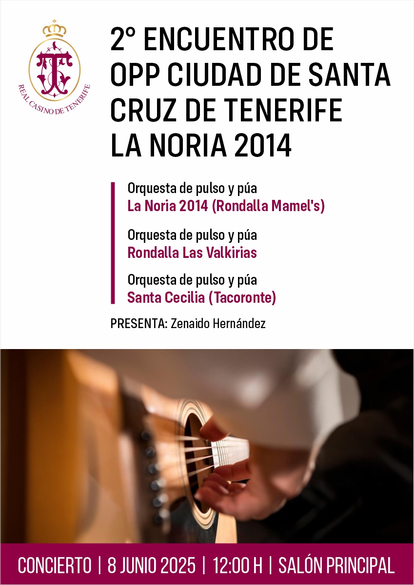 El domingo 8 de junio, a las 12:00 horas, se celebrará en el Salón Principal el segundo encuentro de orquestas de pulso y púa ciudad de Santa Cruz de Tenerife, en el que participarán la Rondalla Mamel’s, Las Valkirias y Santa Cecilia.
