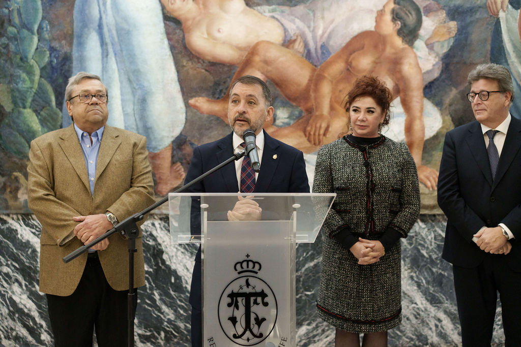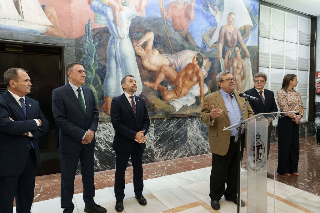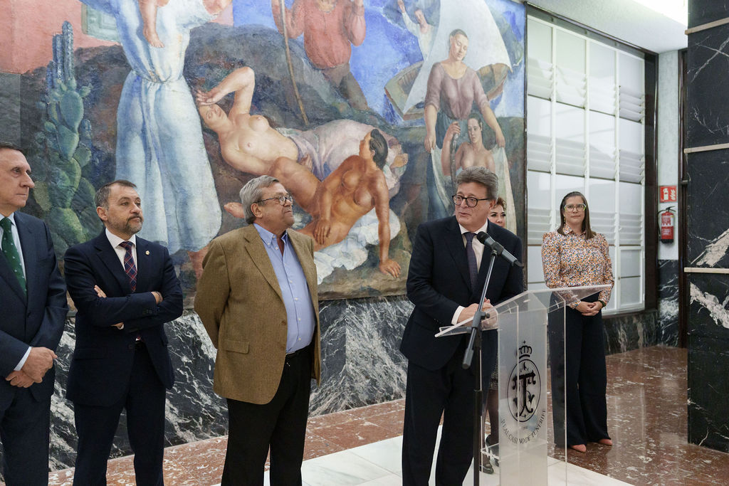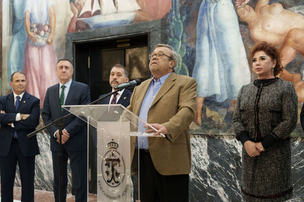En sus palabras, el presidente del RCT destacó que este acto supone un hito en nuestra institución tras meses de arduo y riguroso trabajo desarrollado por Carmen Suárez, destacando que esta enorme labor ha sido posible gracias a la colaboración conjunta de dos grandes instituciones: Cajasiete y Mutua Tinerfeña, que han dado un ejemplo de lo que debe ser la colaboración privada en la conservación bienes que son patrimonio de todos, un símbolo de lo que significa el empuje de la sociedad civil -de la que siempre hemos sido protagonistas- y un compromiso con toda la ciudadanía que puede ya disfrutar y admirar este precioso mural, una de las obras más importantes de la pintura en Canarias, de la que tan orgullosos nos sentimos.
