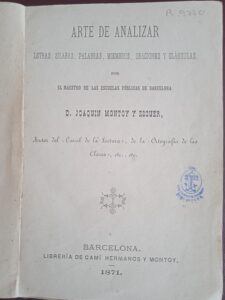 La obra de Joaquín Montoy <<Arte de analizar letras, sílabas, palabras, miembros, oraciones y claúsulas>> publicada en 1871 por la Librería de Camí Hermanos y Montoy, forma parte de estos pequeños fascículos ofrecidos a los maestros suscriptores de El Clamor.