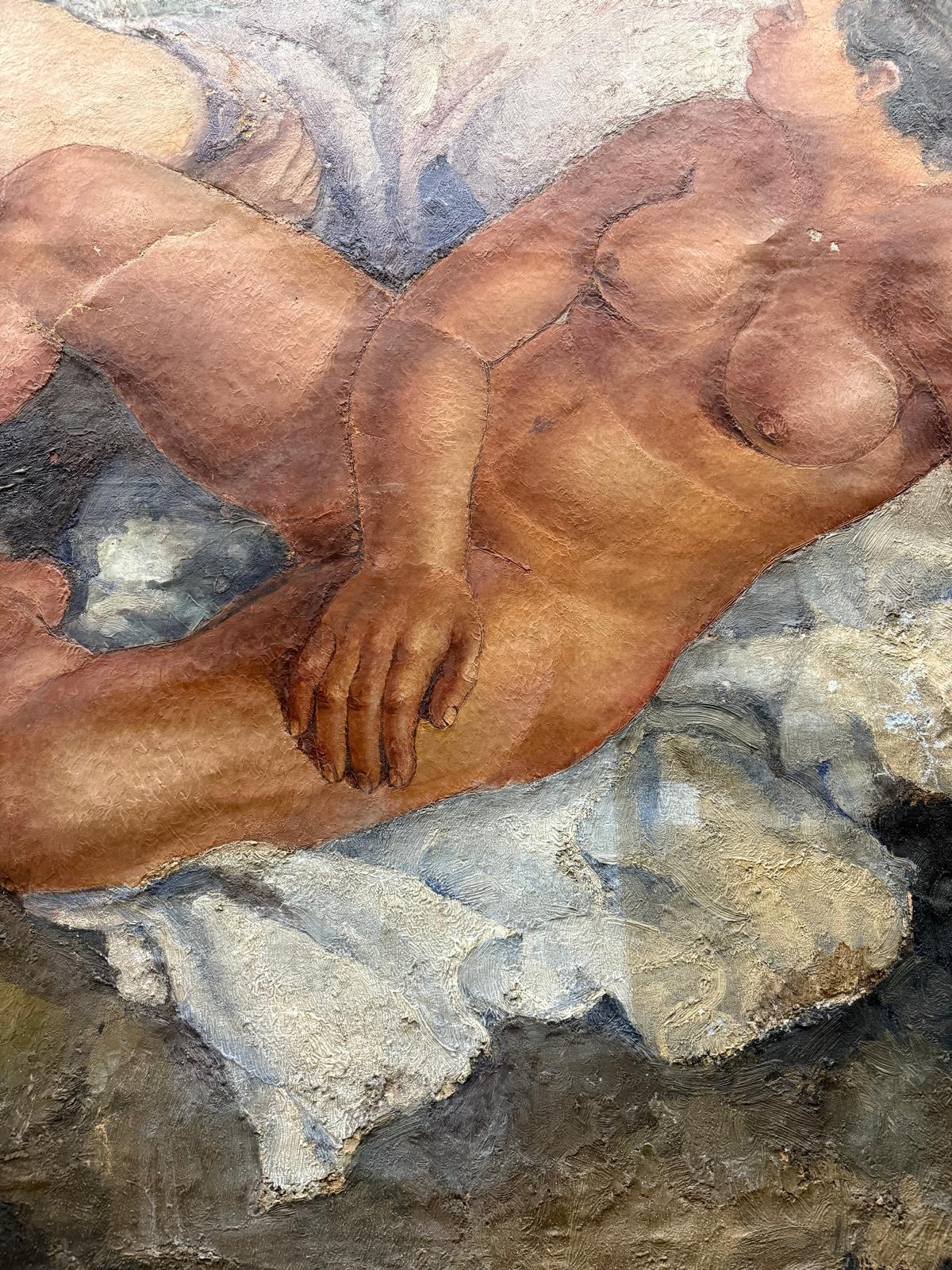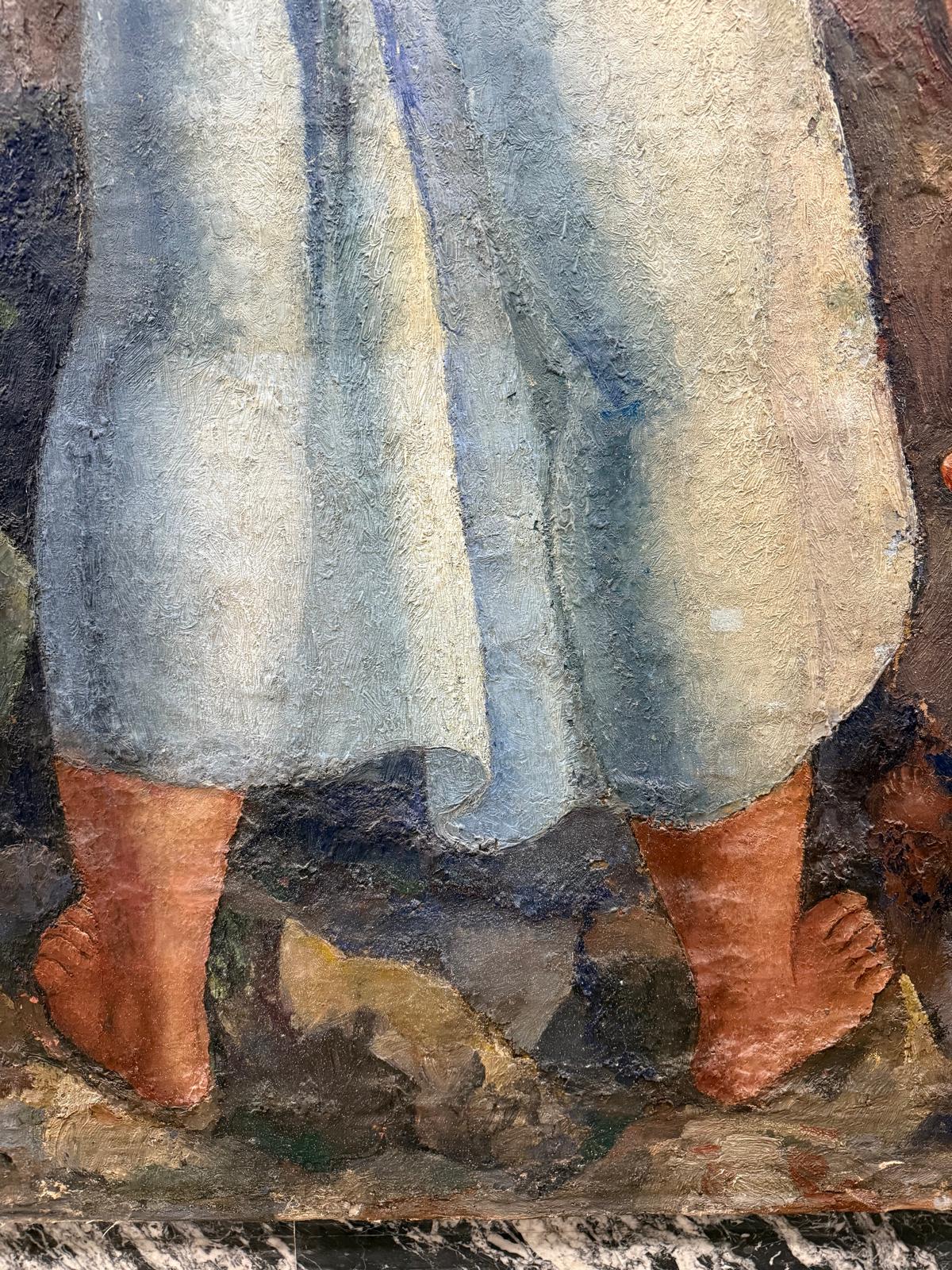 La obra refleja un clasicismo formal, evidente tanto en la ordenación compositiva como en la solidez y el volumen de las figuras, esculpidas con una paleta vibrante y luminosa de colores intensos y ácidos, que muestran la influencia del arte renacentista, particularmente el de Masaccio y Miguel Ángel, tras la estancia del pintor en Italia en 1930.