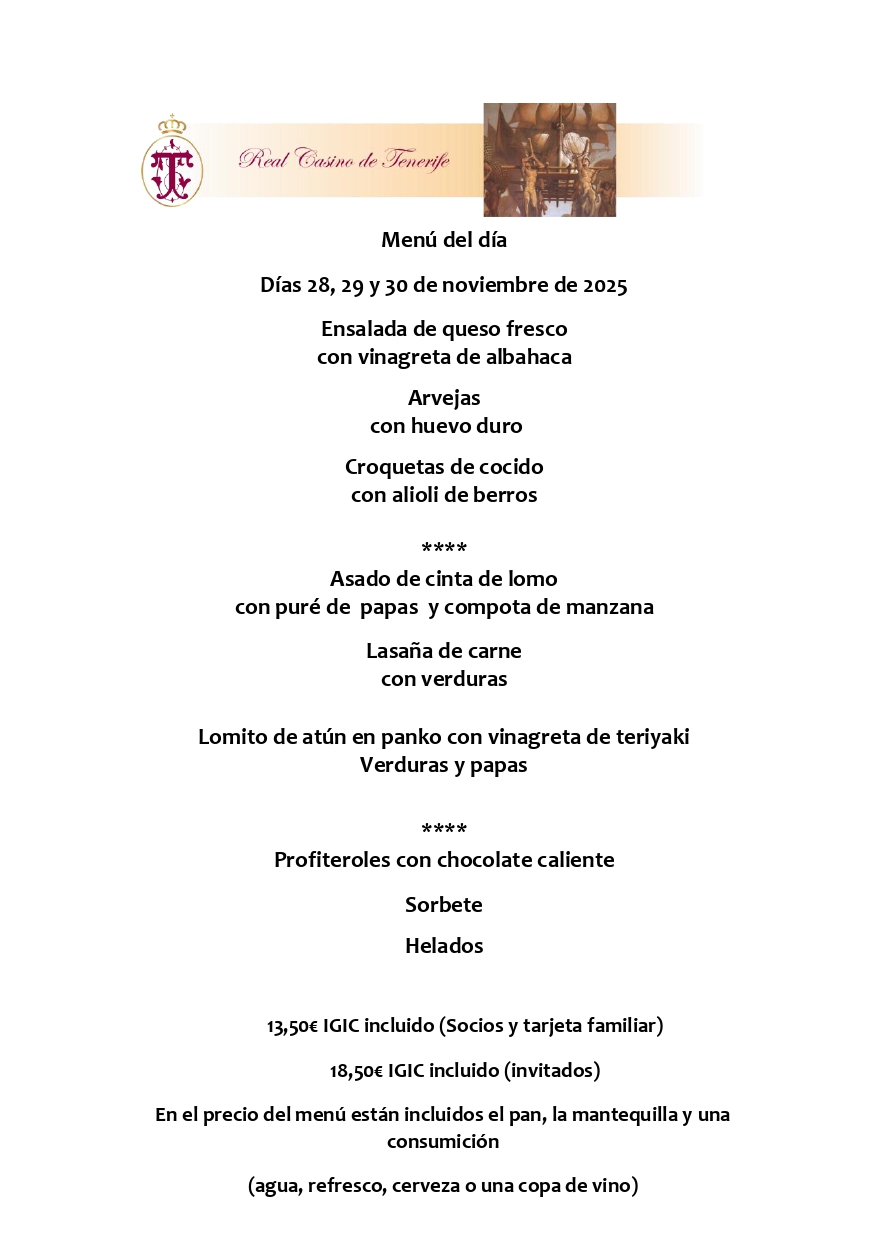 El menú del día disponible en el restaurante Terraza para los señores Socios y acompañantes es el siguiente: