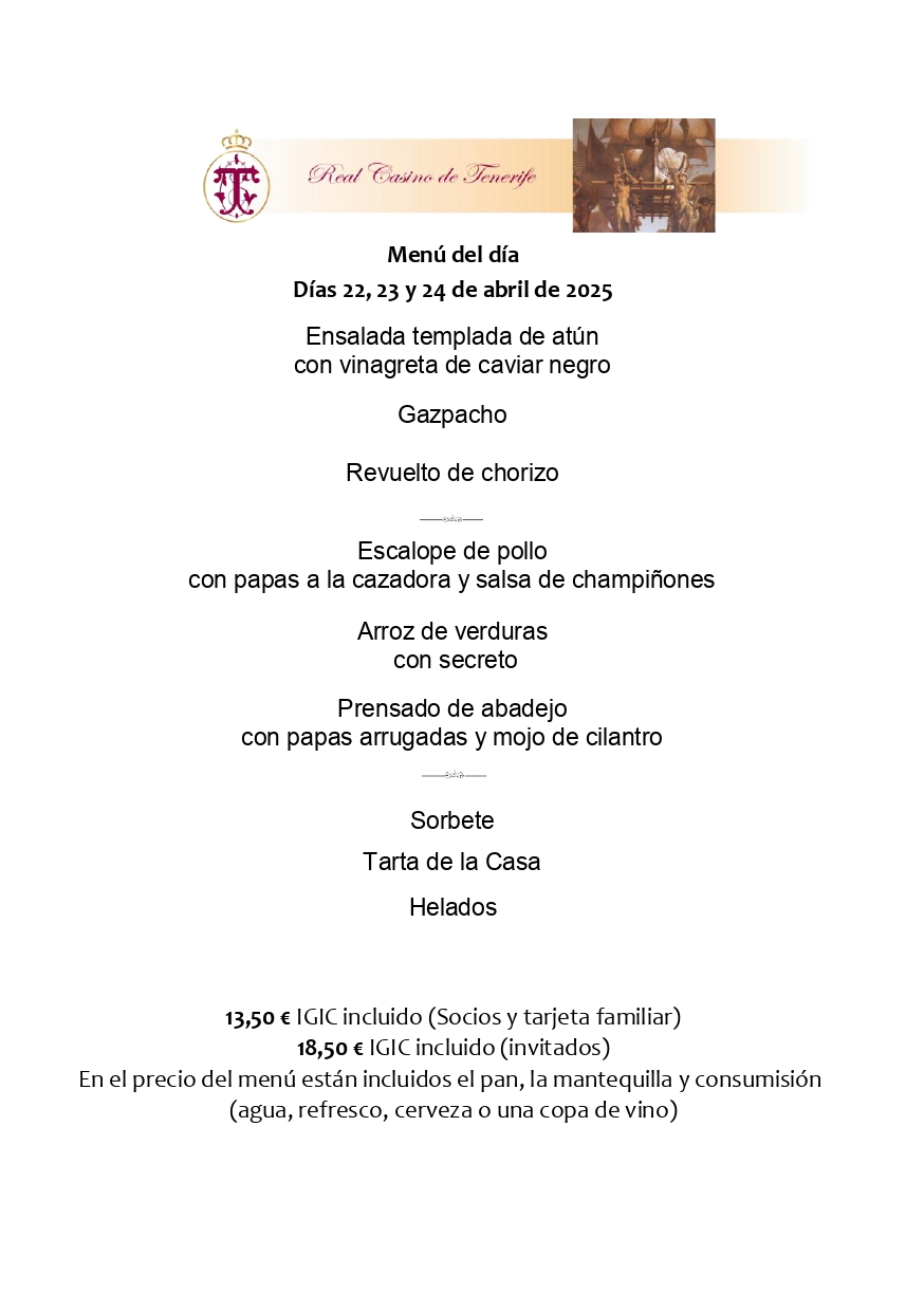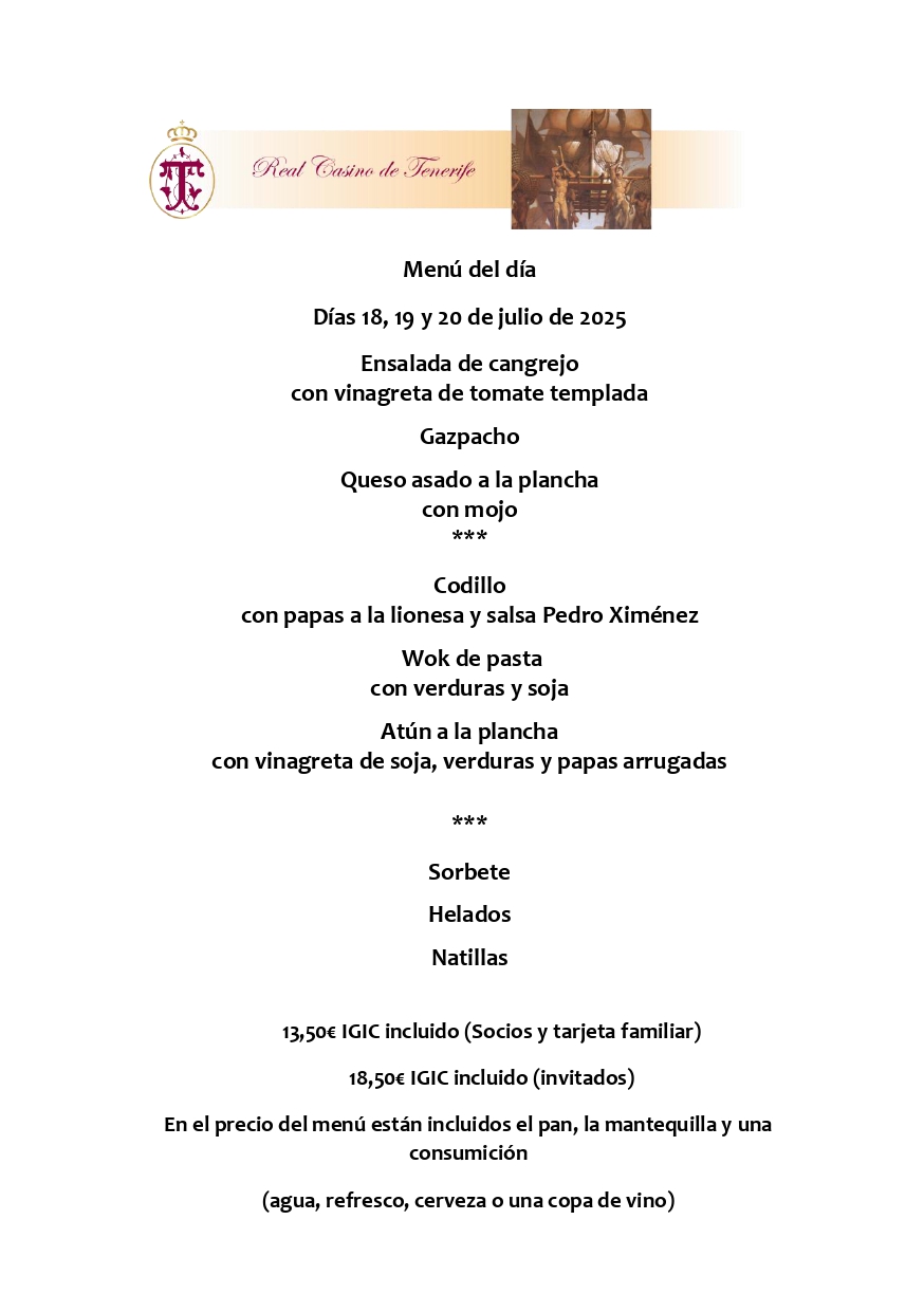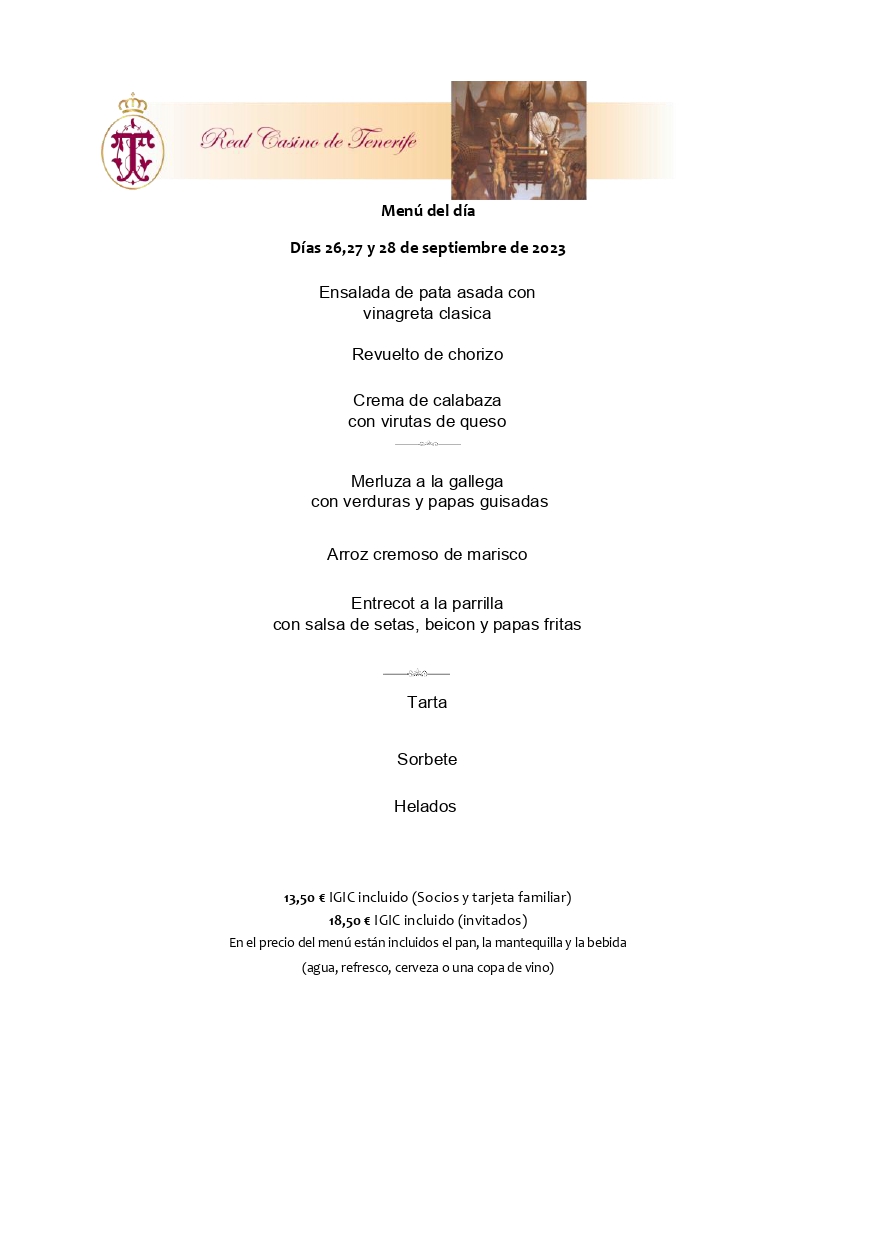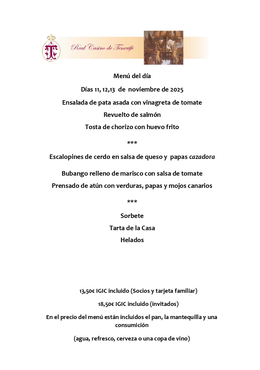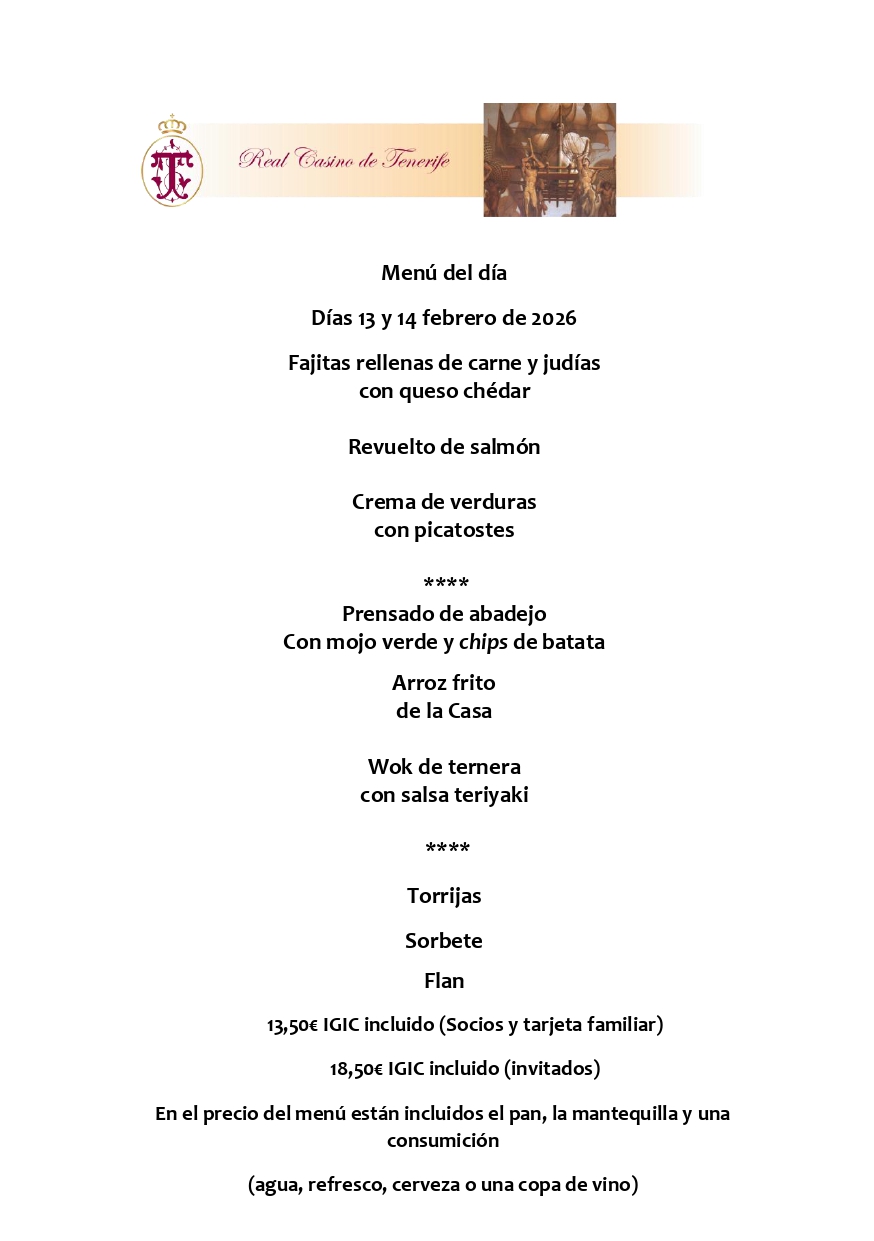 El menú del día disponible en el restaurante Terraza para los señores Socios y acompañantes es el siguiente: